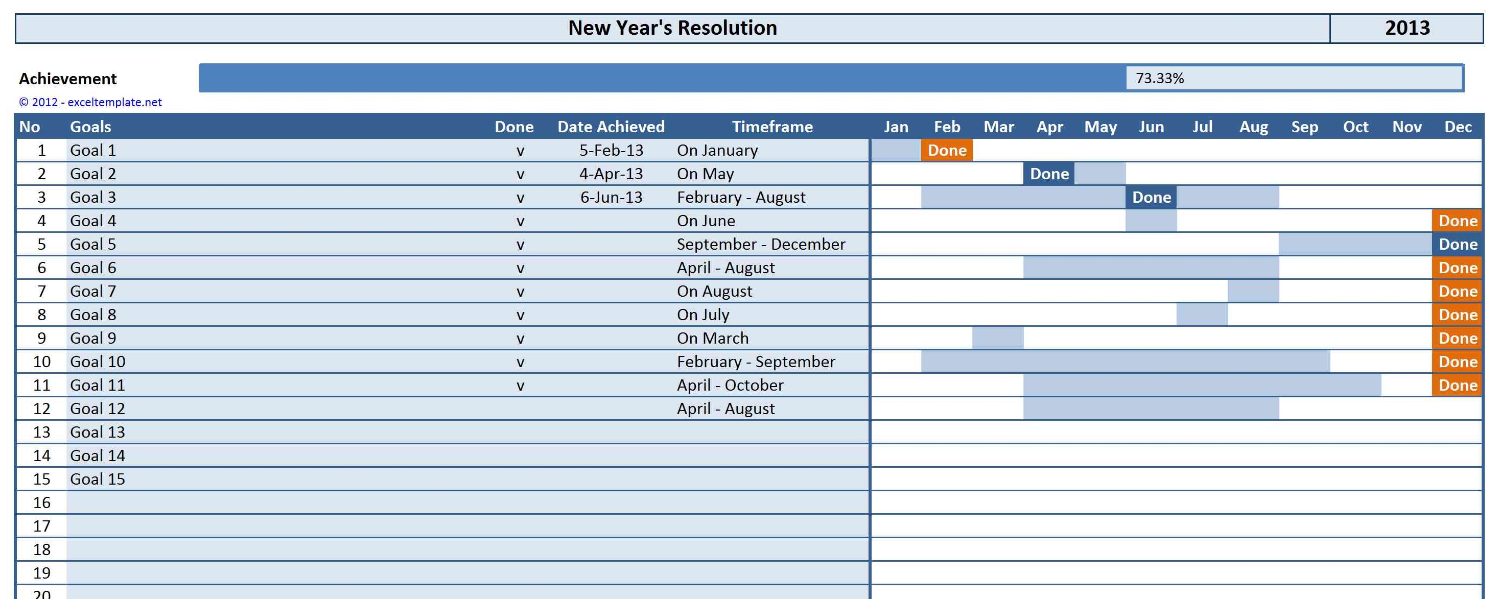 There 2 models available to be used with Excel. The dynamic template will allow you to define a month or range of month that you think you will fulfill your resolution. It is equipped also with conditional formatting formula that will colorize your resolution if you complete it before your due month or if you miss it. The simple model will only give you table for you to fill without any target but there is a progress column where you can type it “done” when you fulfill it. And there is a progress bar on top of the table that will show your completion every time you update the spreadsheet.